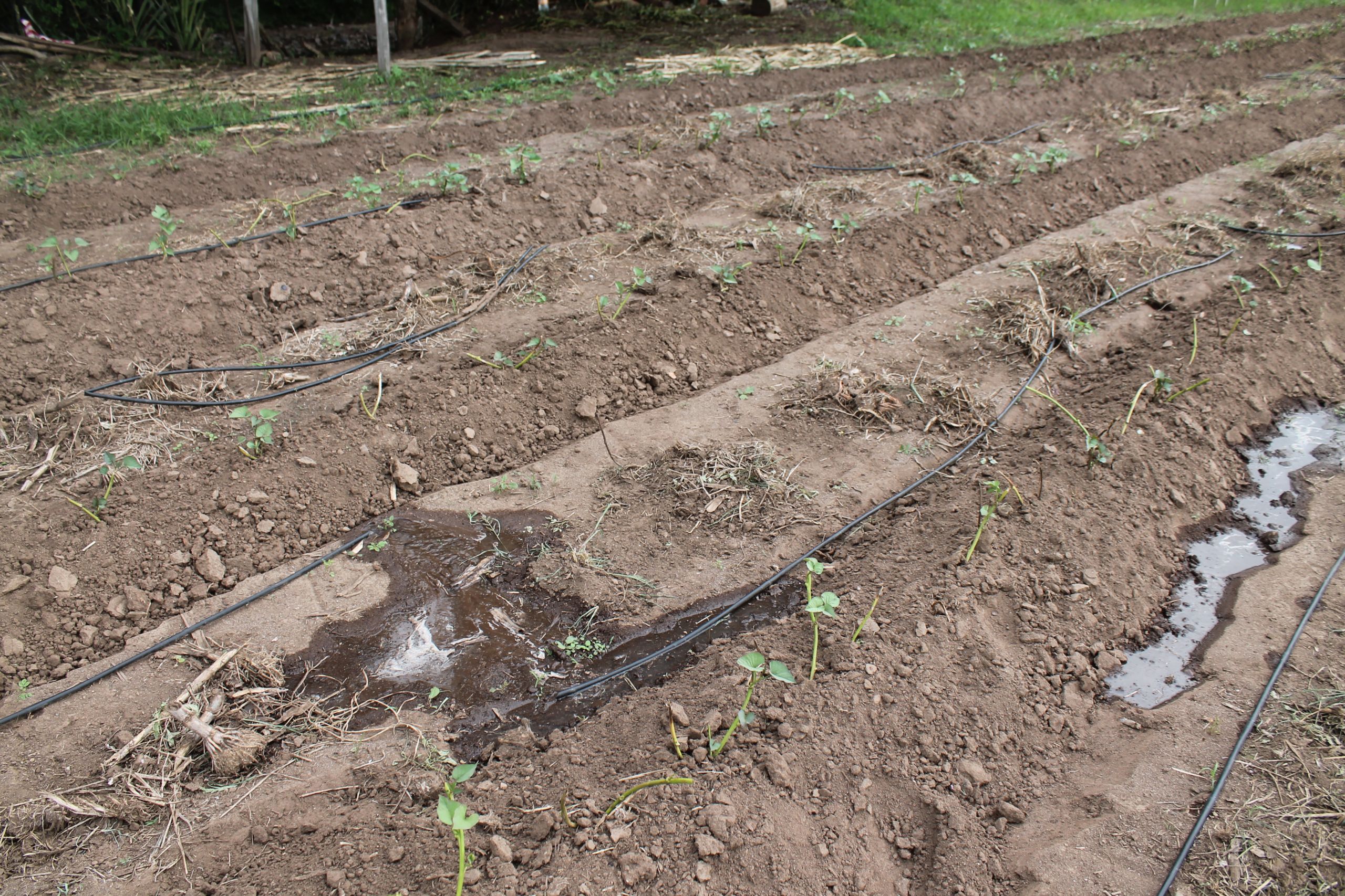 Although formal Global Communities support has ended, the farmers continue to maintain the system for use when rains are sparse. Pipes travel from the reservoir down the watershed and across a stream, with gravity propelling water to the fields. The pipes connect to thin rubber hoses that run along each bank of plants, with tiny holes ready to distribute water when the sky has not done so. Each hole can produce a liter of water in two hours, which is sufficient to keep the crops going when rain is infrequent.
