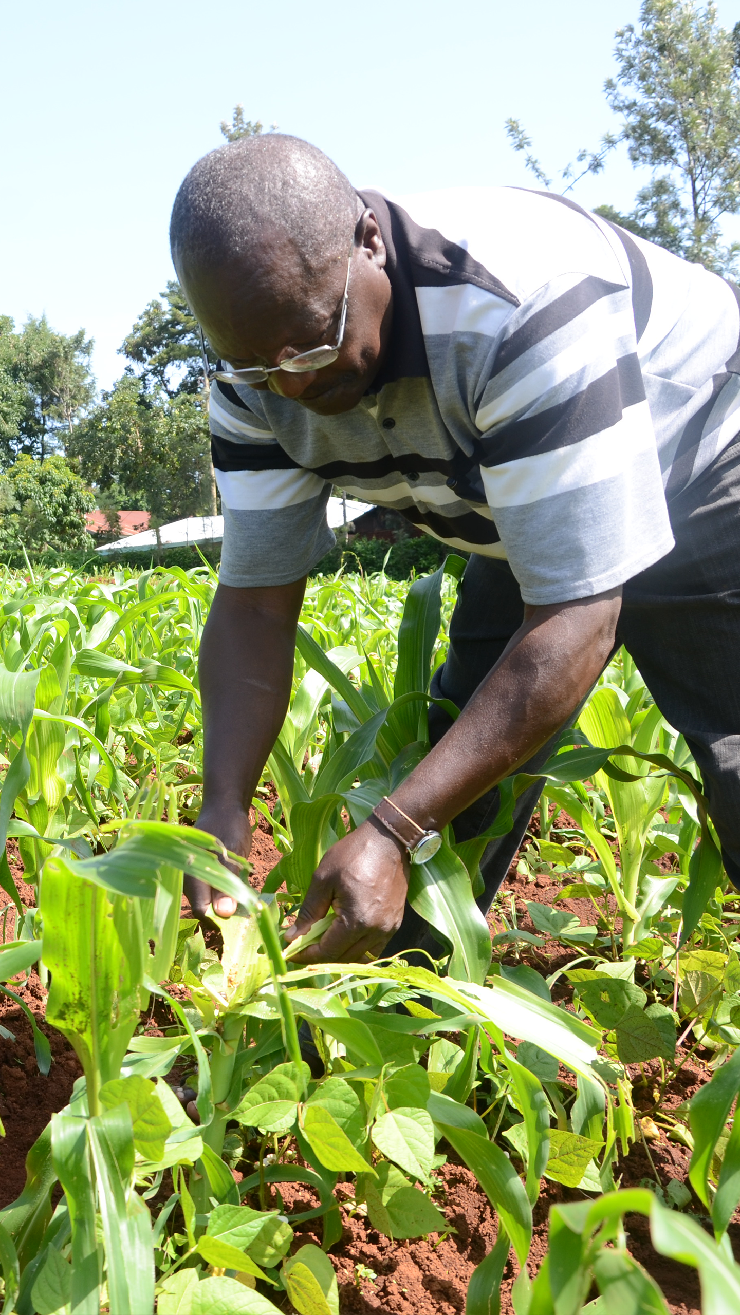 Farmer examines plant for fall armyworm