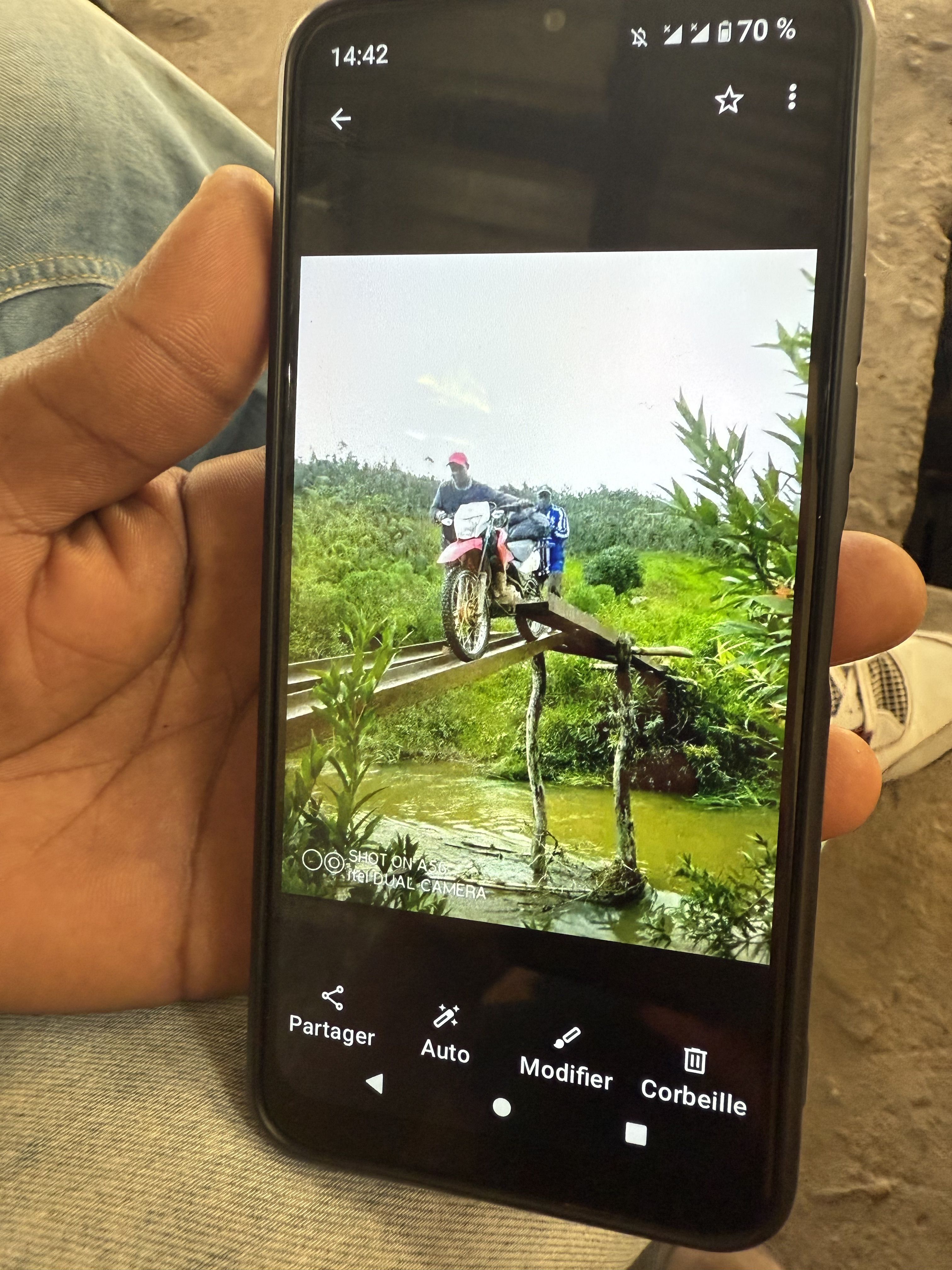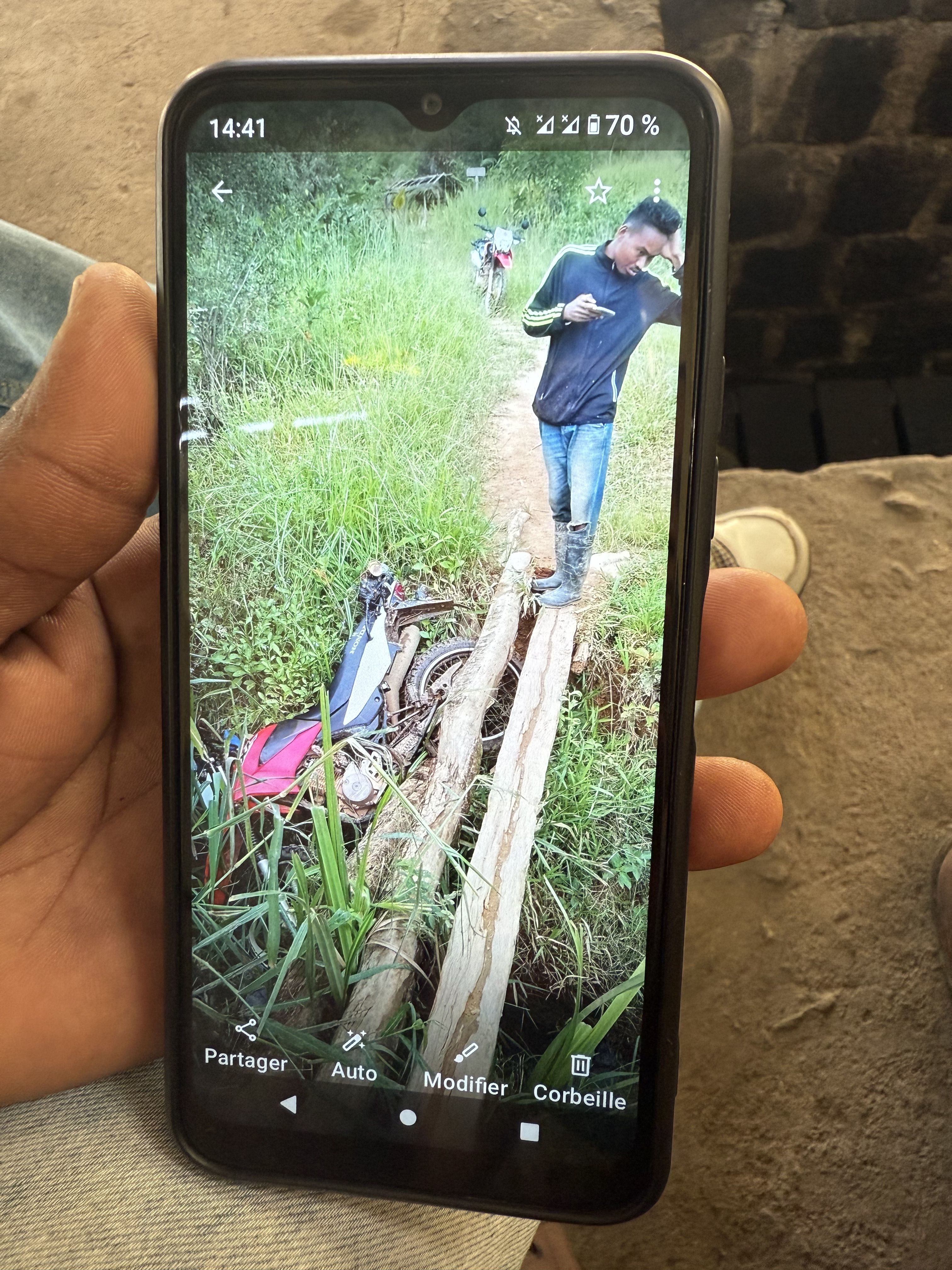 Mahmias held up a picture on his phone of two sticks used as a rickety bridge. One driver guides the motorcycle over the bridge on foot from the front, and another from behind.