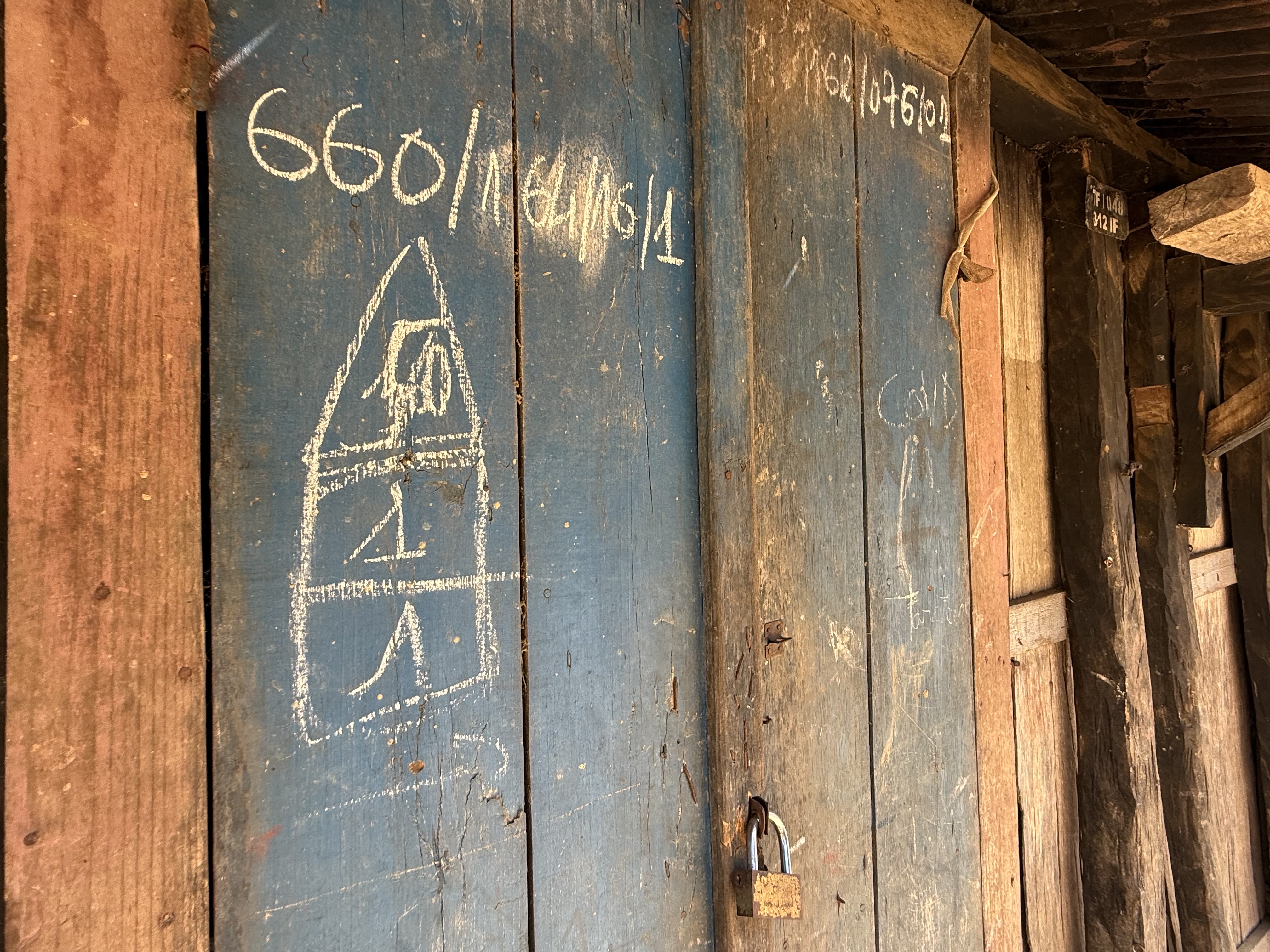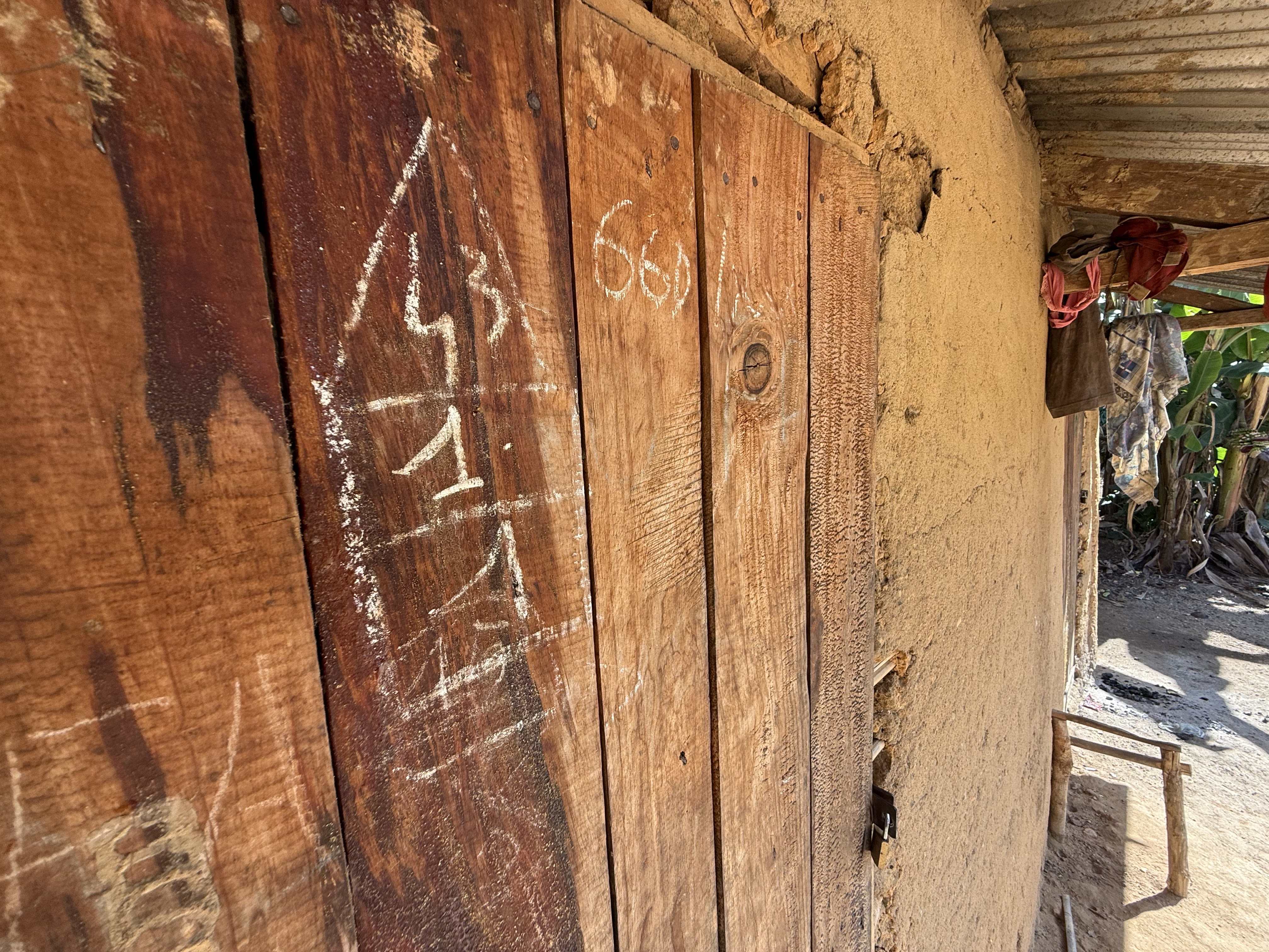 Within the roof is the number assigned to the house, the upper floor has the number of inhabitants under 5 years old, and the bottom has the number of children at home and vaccinated when campaigners visited.