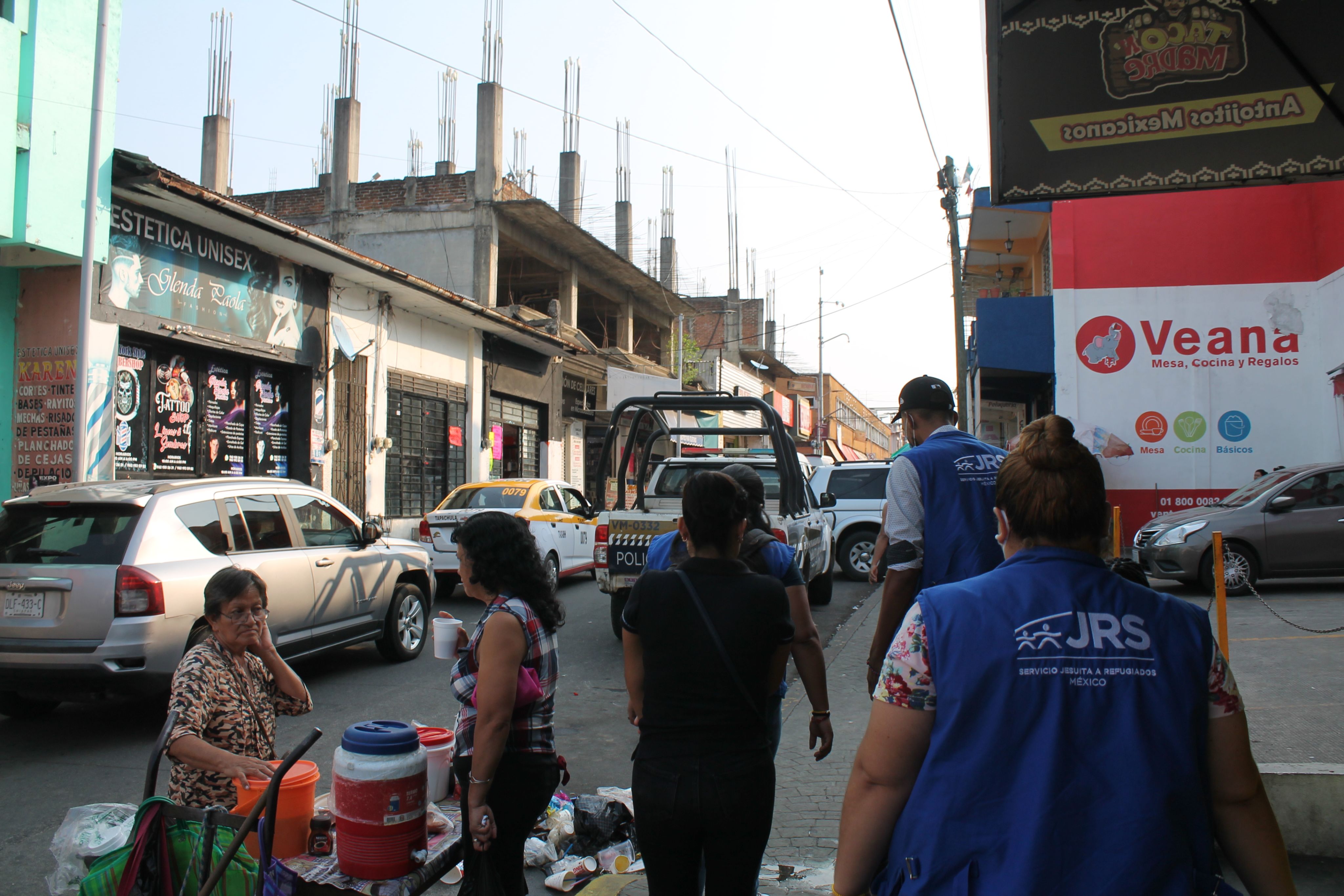 Jesuit Refugee Service staffers visit downtown Tapachula to speak with migrants.
