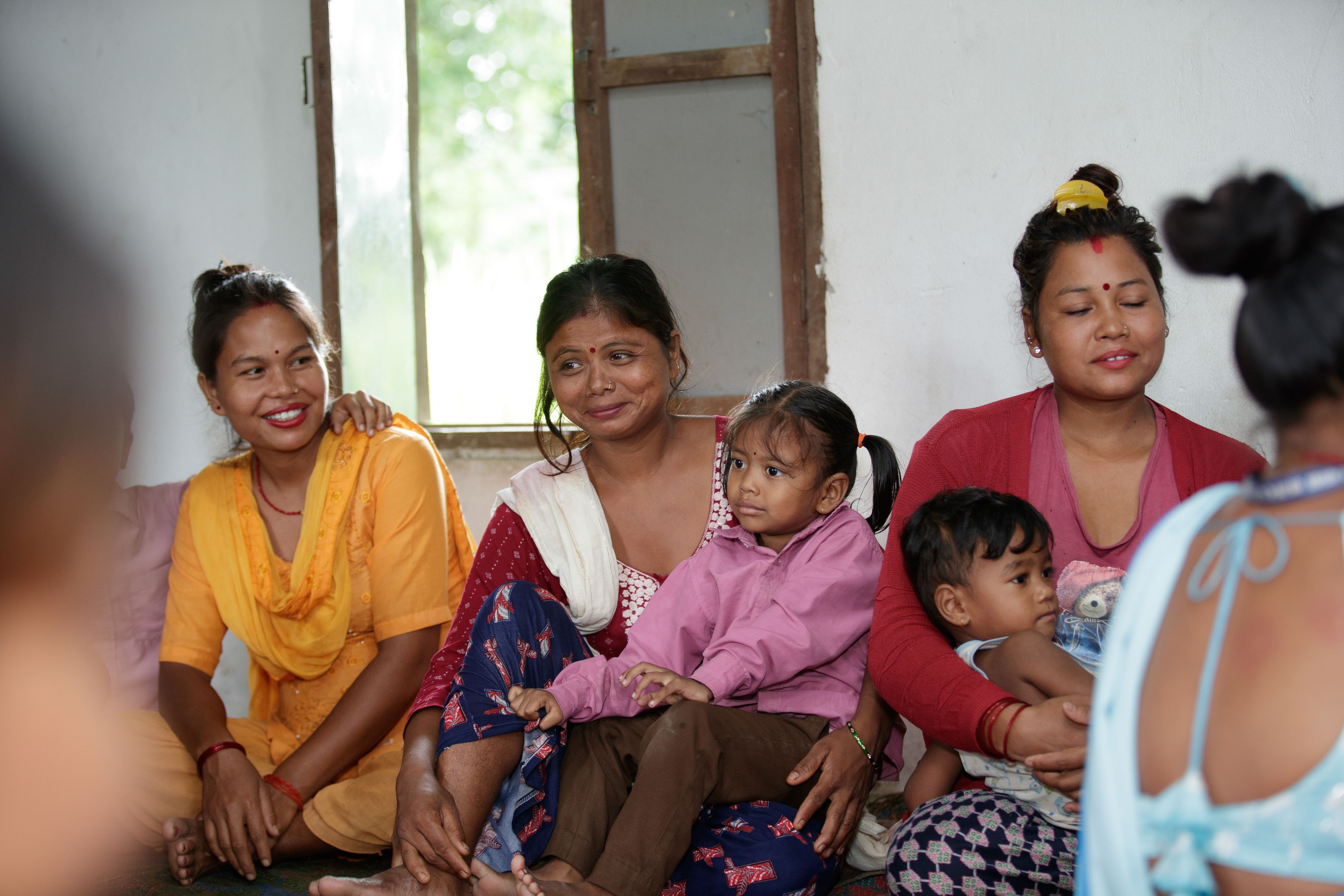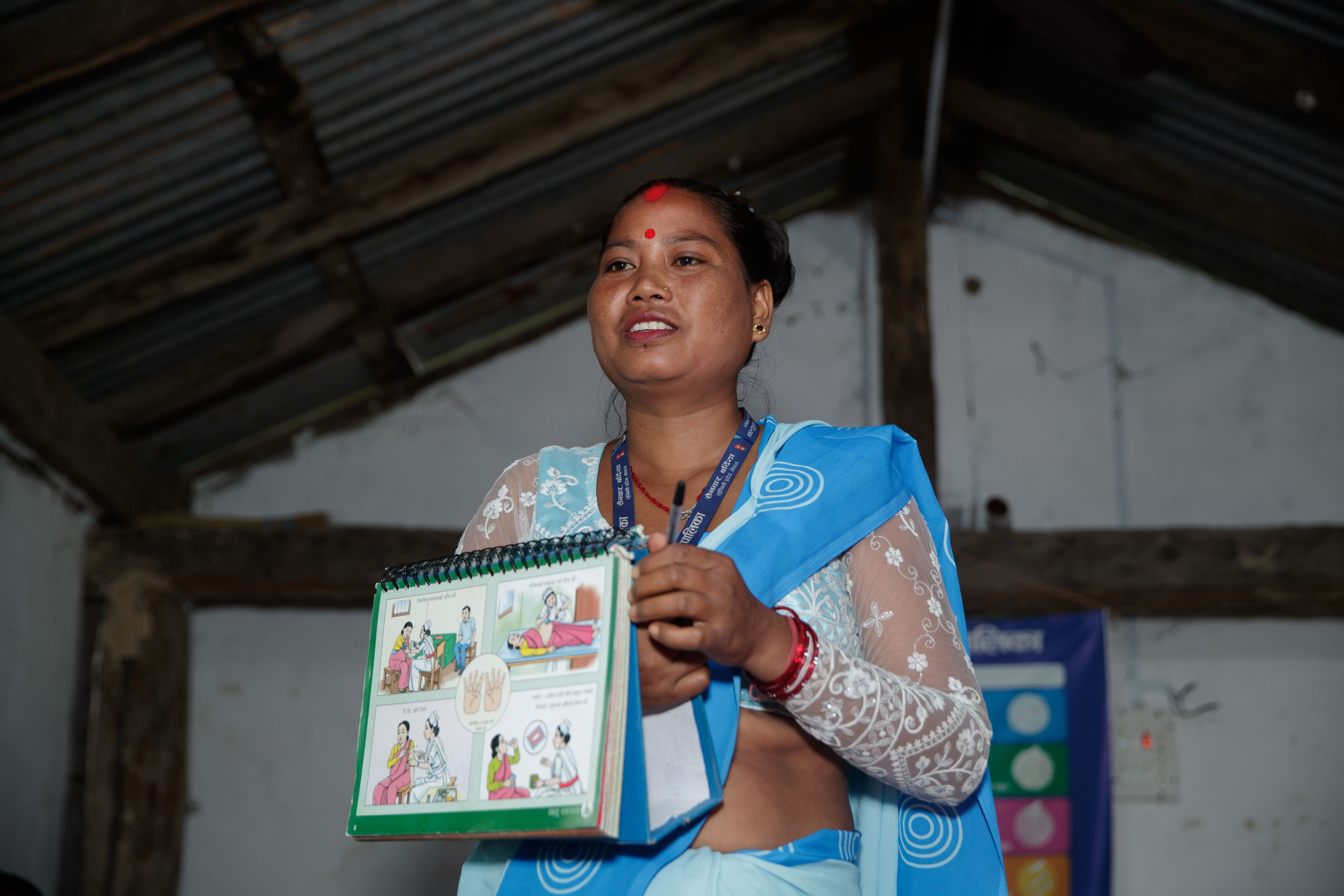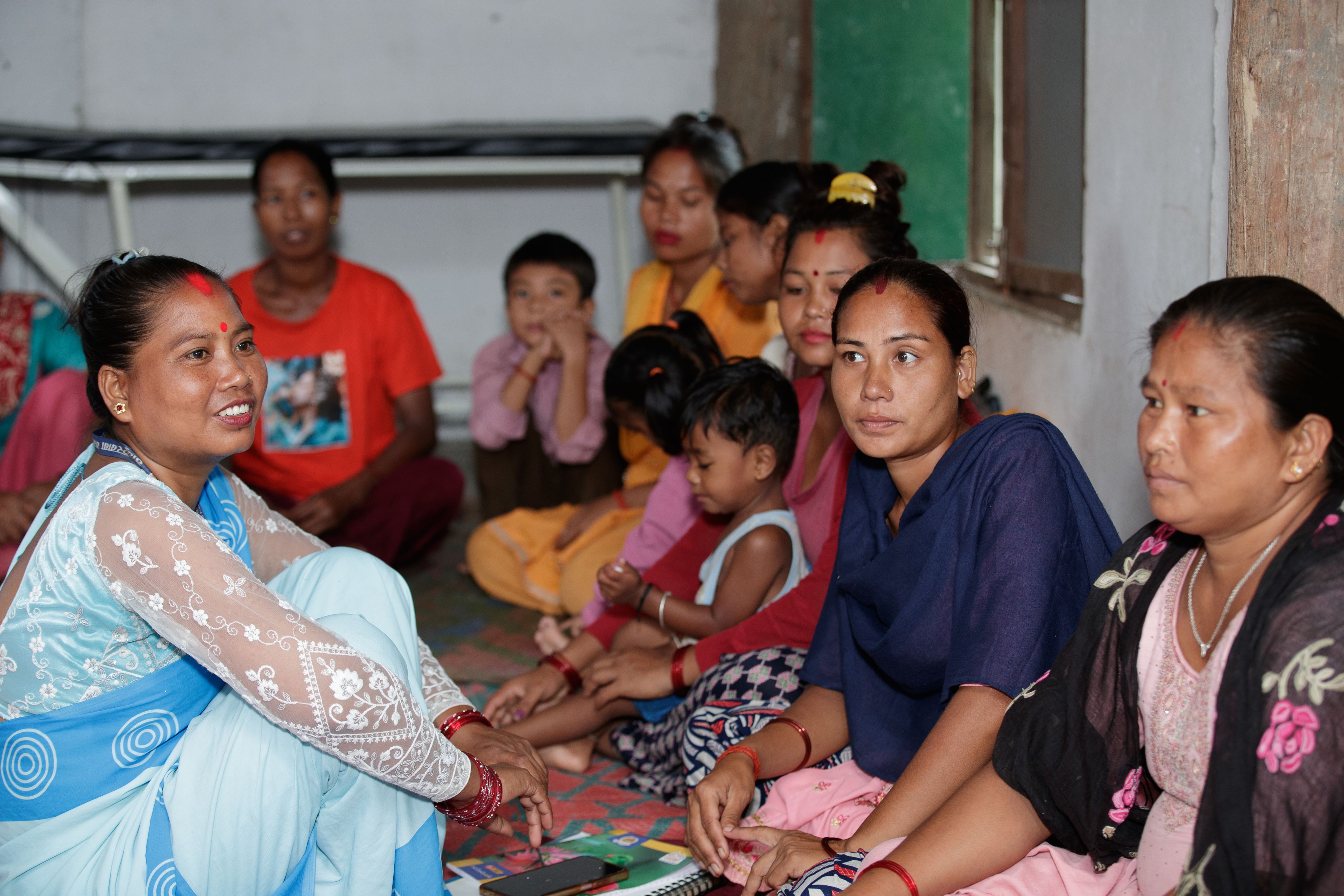 On a rainy morning, around 25 women from the nearby villages gather in a small community building for the monthly meeting. Kumari Tharu, dressed in the light blue sari worn by female community health volunteers, talks about topics such as what to eat during pregnancy, the importance of breastfeeding, and what to feed underweight babies. The women listen attentively, some accompanied by young children or with babies in their laps.