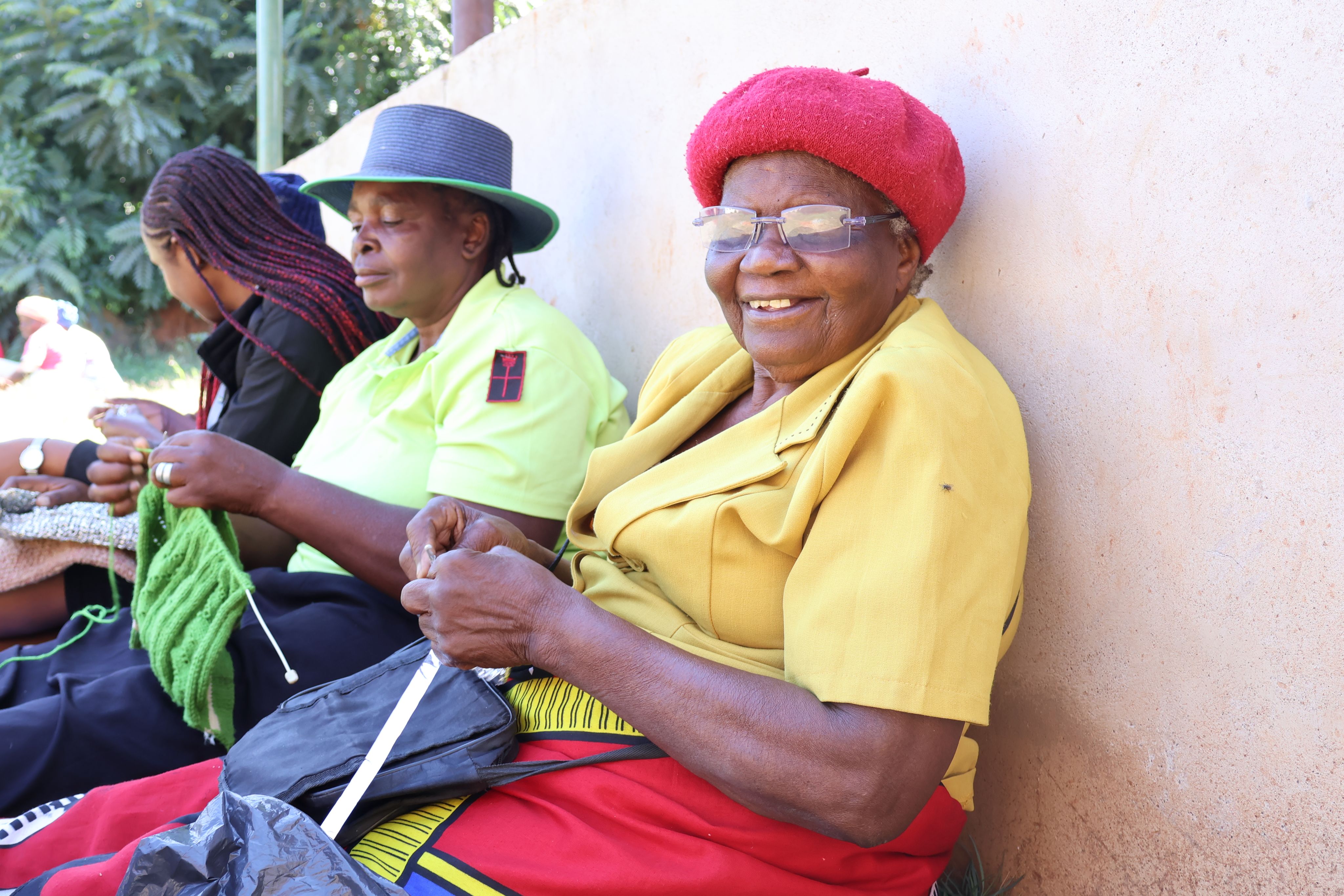 Grandmothers at Rujeko DZ Poly primary health care clinic in Harare, crocheting Zee Bags in a peer-led support group. Photo: Friendship Bench